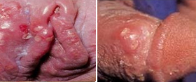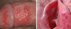 好发部位:男性多发生于龟头、冠状沟、尿道口、阴茎体及阴囊。女性好发于外阴、阴道及宫颈。两性均可见于肛周、大腿及臀部。